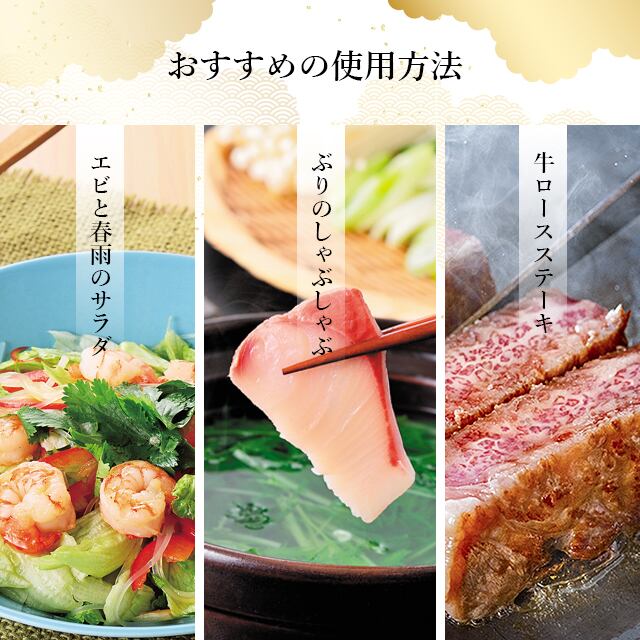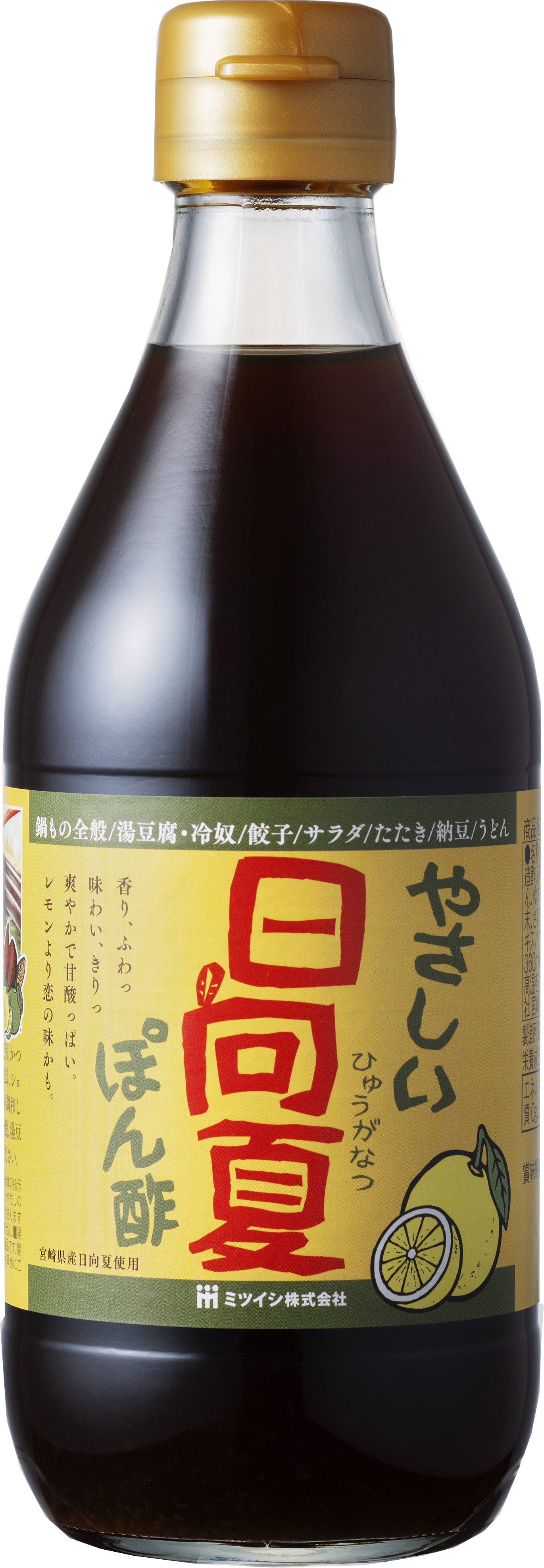しょうゆ(国内製造)、醸造酢、砂糖、日向夏濃縮果汁(日向夏(宮崎県産))、本みりん、ゆず果汁、食塩、昆布エキス、かぼす果汁、かつお節粉末、さば節、黒蜜、うるめ節、ジンジャーエキス、しいたけエキスパウダー、(一部に小麦・大豆・さばを含む)
