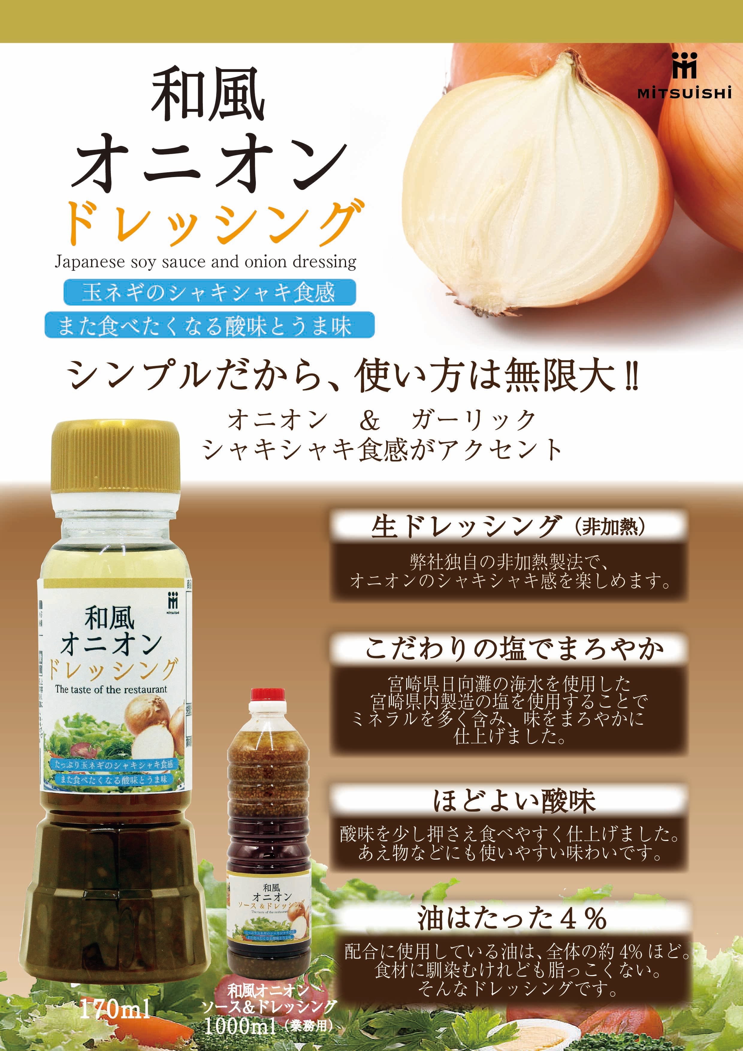 ミツイシ独自製法の、シャキシャキ食感を活かしたオニオンソース&ドレッシングをお楽しみください。